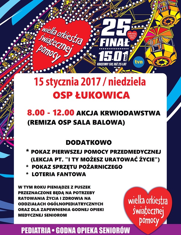 W tym roku oprócz charakterystycznego czerwonego serduszka WOŚP mamy do rozdania opaski i breloki odblaskowe. W remizie od rana od godziny 8.00 do południa będziemy prowadzić zbiórkę krwi. Zapraszamy wszystkich, którzy chcą podzielić się najcenniejszym darem - krwią.
