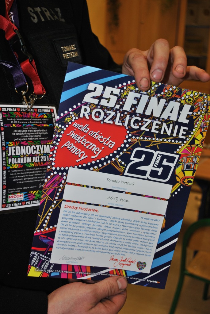 25 finał WOŚP 2017 - OSP ŁukowicaW niedzielę 15 stycznia br. odbył się 25 Finał Wielkiej Orkiestry Świątecznej Pomocy. Jak co roku w akcję zbiórki pieniędzy włączyło się w całej Polsce mnóstwo osób i organizacji. Nie mogło oczywiście zabraknąć wolontariuszy z Ochotniczej Straży Pożarnej w Łukowicy, którzy po raz czwarty kwestowali - tym razem na potrzeby ratowania życia i zdrowia na oddziałach ogólnopediatrycznych oraz dla zapewnienia godnej opieki medycznej seniorom.