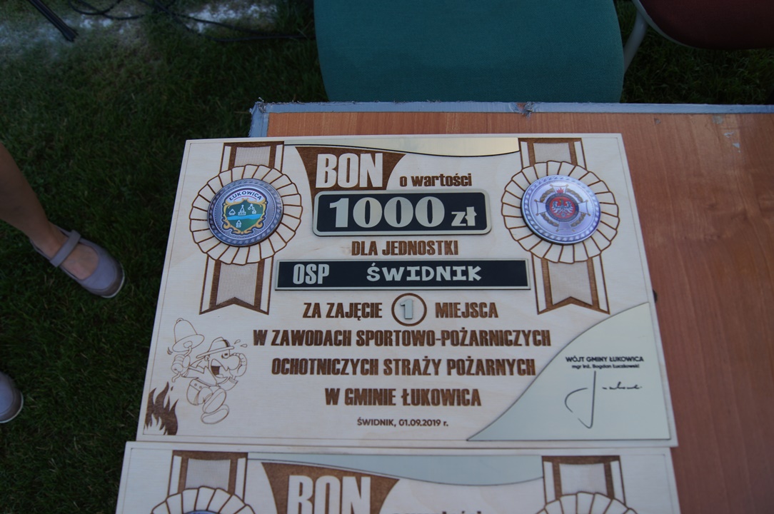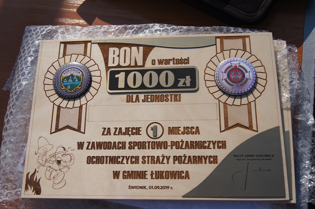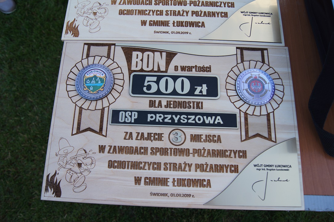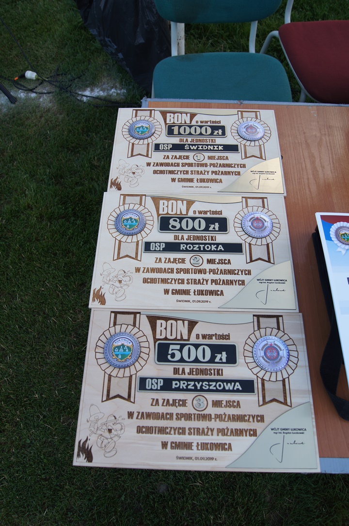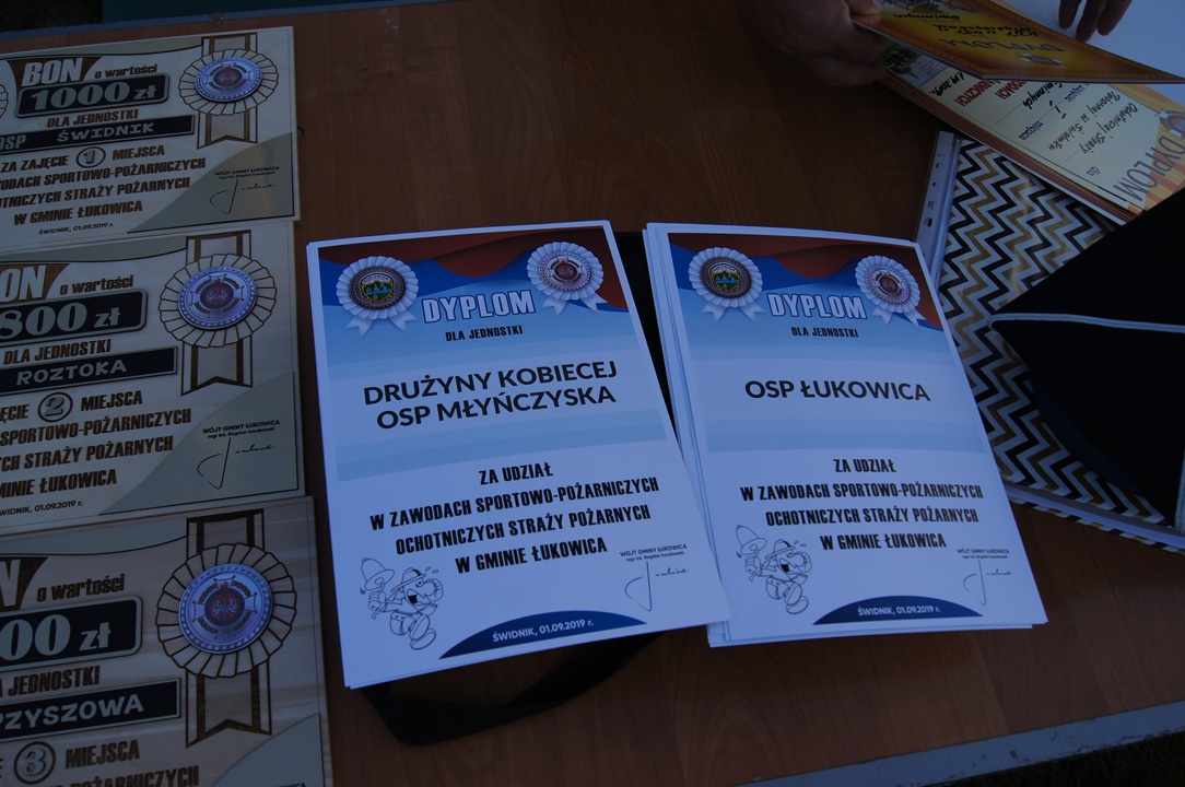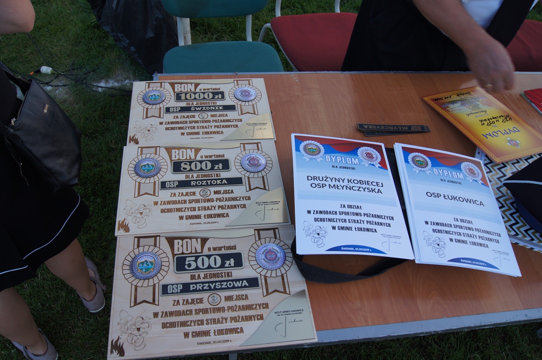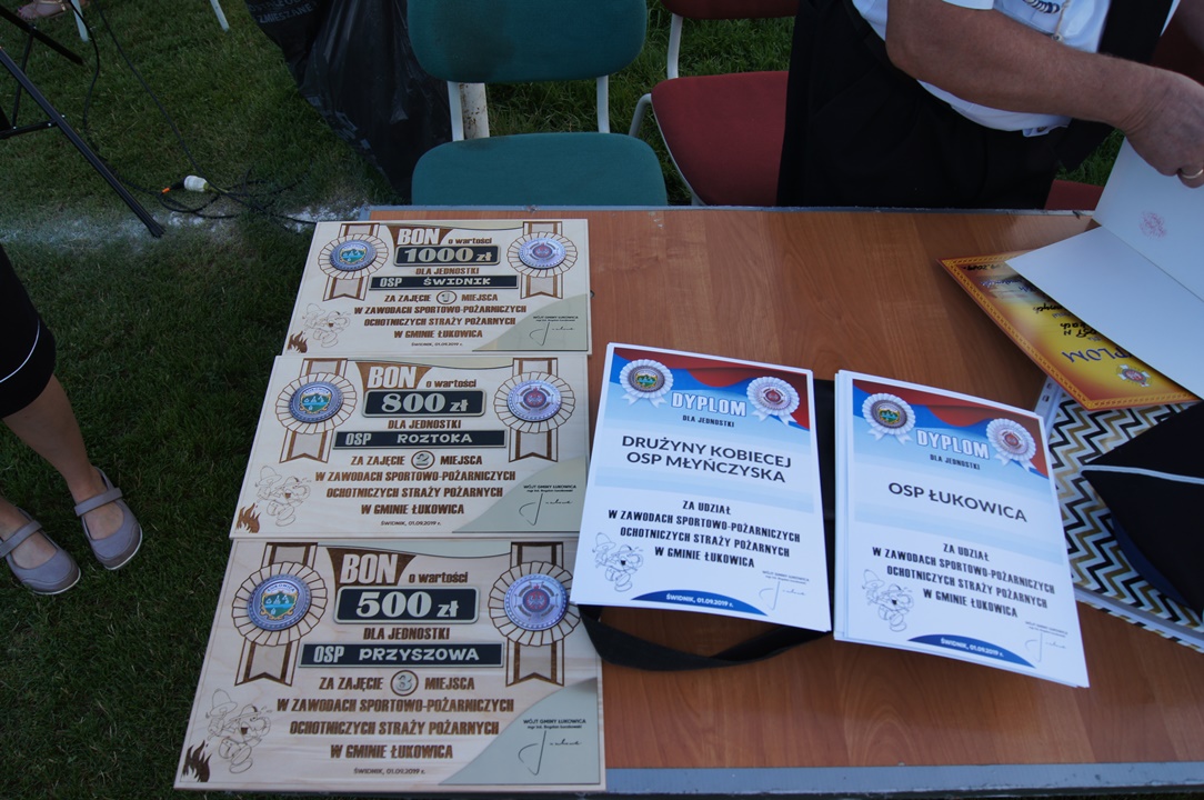 Na zakończenie drużyny otrzymały BONY PIENIĘŻNE w wysokości 1000 zł za I miejsce, 800 zł za II miejsce, 500 zł za III miejsce, które zostały wręczone przez Wójta Gminy Łukowica Bogdana Łuczkowskiego, w asyście Prezes Zarządu Gminnego ZOSP RP Bronisława Kunickiego oraz Urszuli Nowogórskiej. Pozostałe drużyny otrzymały dyplomy za udział w zawodach.