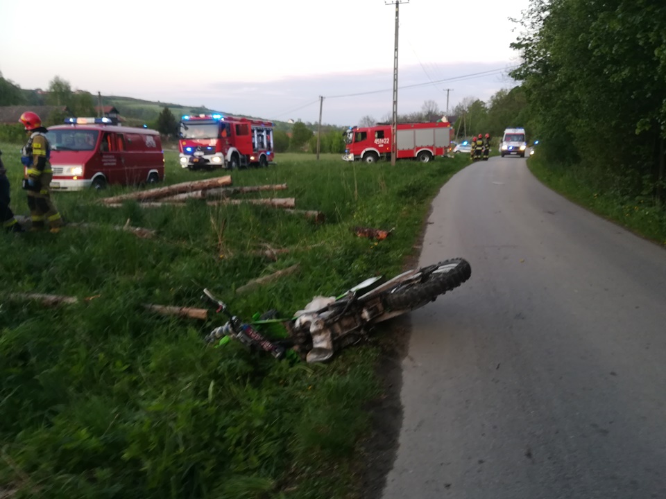 Po dojeździe na miejsce zdarzenia zastano dwa uszkodzone pojazdy (samochód osobowy i oddalony o kilka metrów motocykl), a obok samochodu 17-letniego motocyklistę z ciężkimi obrażeniami ciała. Od razu przystąpiono do udzielania kwalifikowanej pierwszej pomocy.