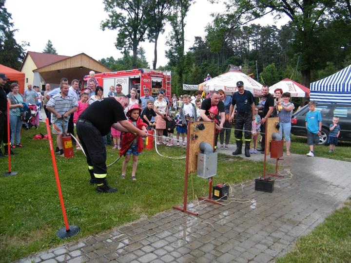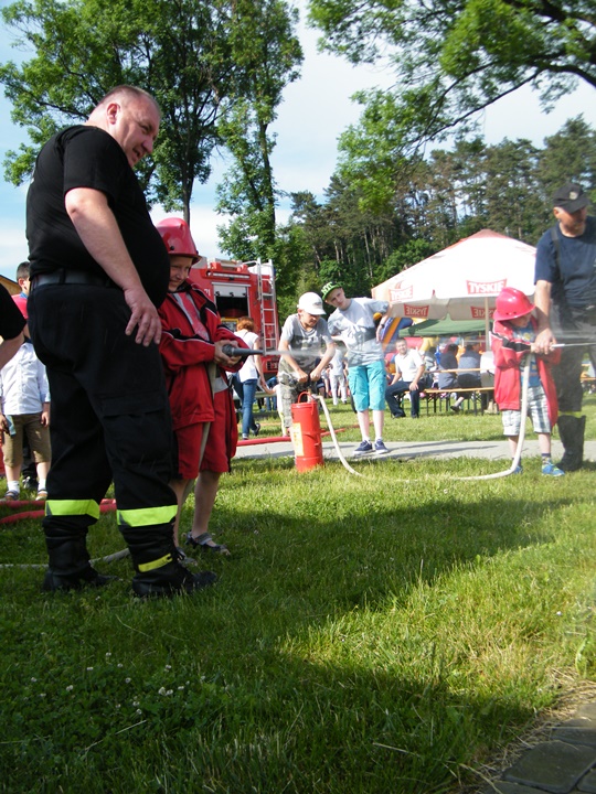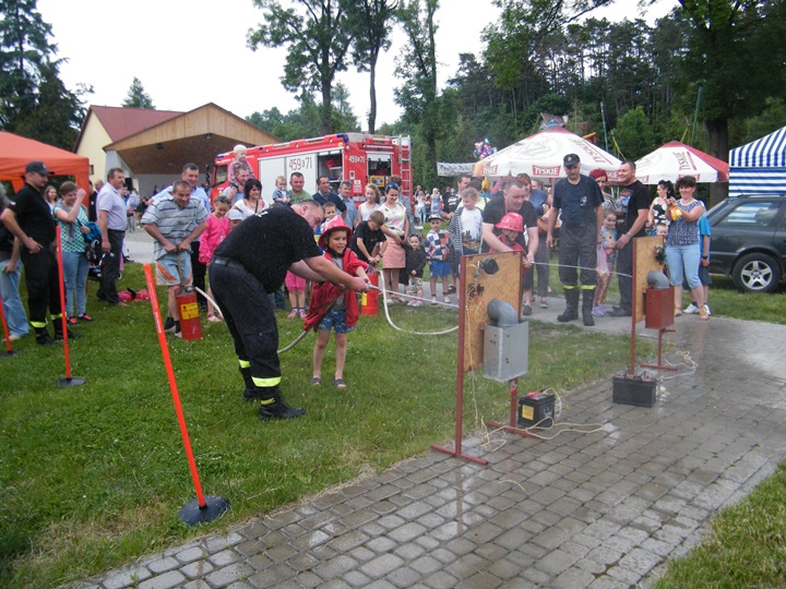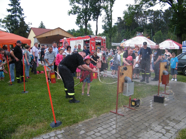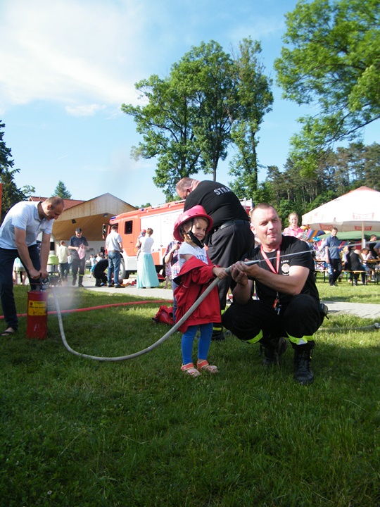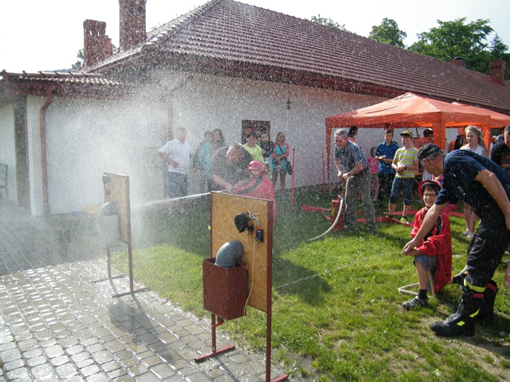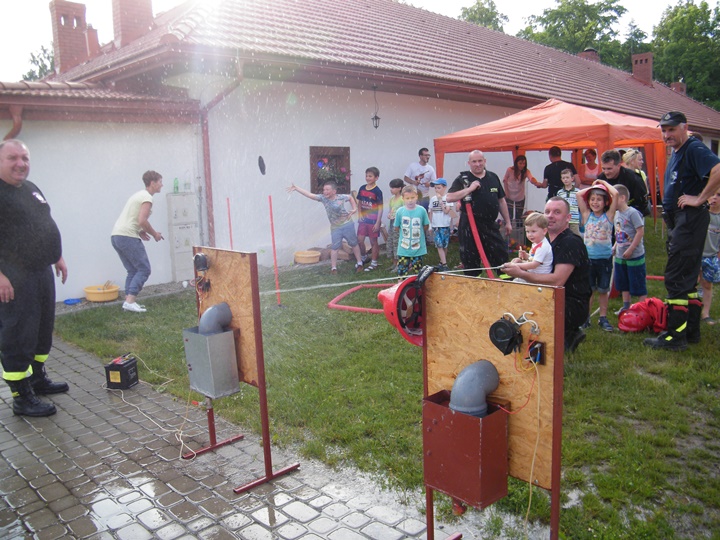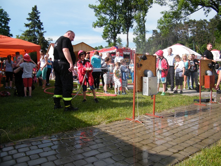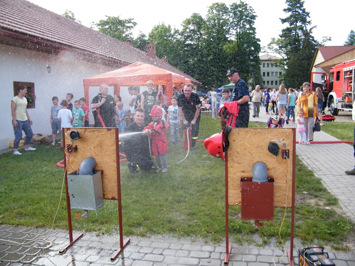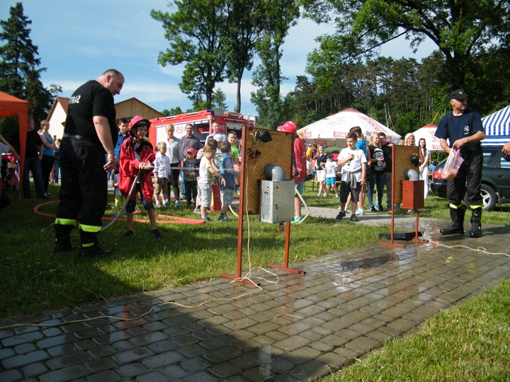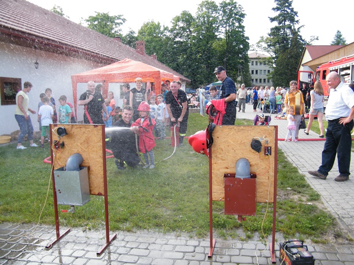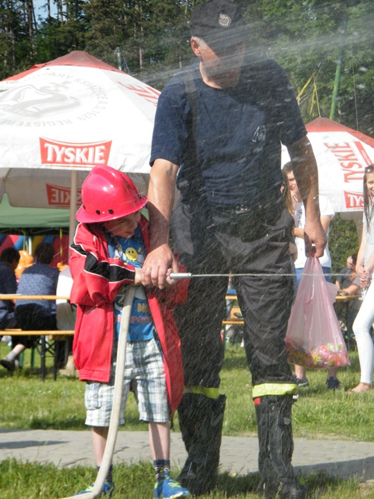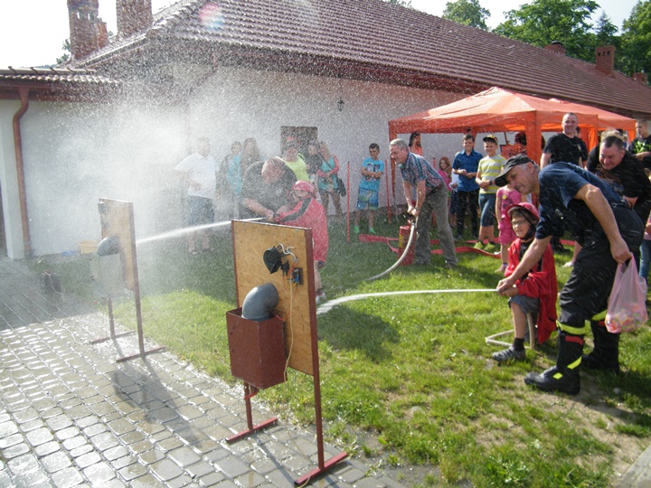 Po wlaniu odpowiedniej ilości wody, zapalała się lampka sygnalizacyjna i rozlegał się sygnał akustyczny - syrena! Nad zaopatrzeniem wodnym z prądownicą w ręku czuwał dh Andrzej Kożuch. Rywalizacja ta spotkała się z bardzo dużym zainteresowaniem wśród zgromadzonych dzieci, które wczuwały się w pracę strażaka ubierając do tej konkurencji hełm strażacki i bluzę OSP. Nagrodą dla dzieci za ukończoną konkurencję były słodycze wręczane przez Prezesa OSP. Nad sprawnym przebiegiem konkurencji czuwali strażacy z naszej OSP, w tym Prezes dh Józef Pietrzak oraz dh Michał Sułkowski - opiekun Młodzieżowej Drużyny Pożarniczej, a zarazem pomysłodawca zabawy.