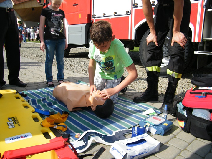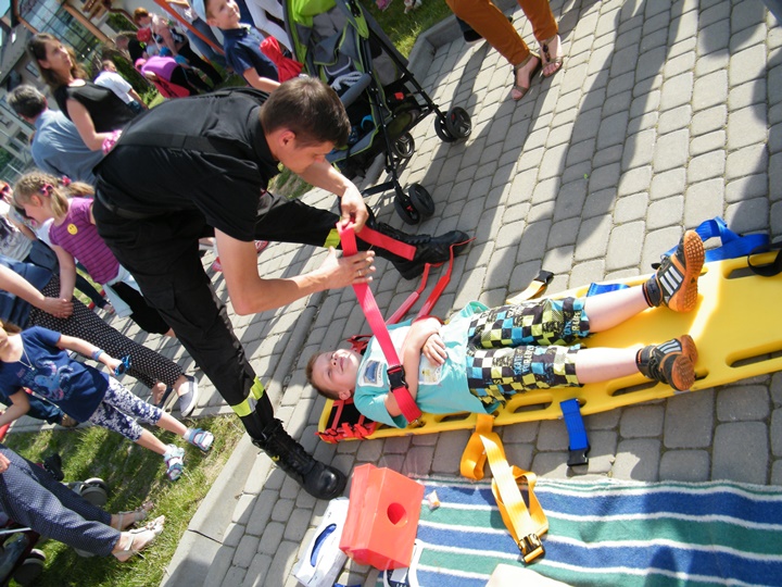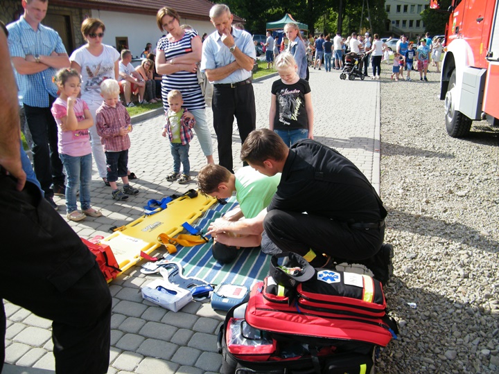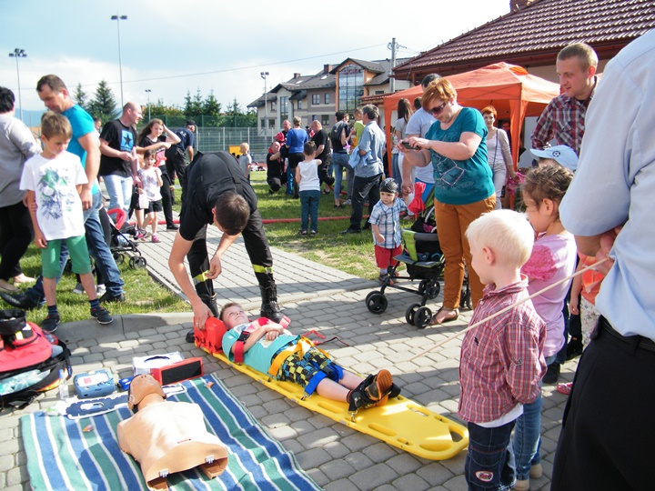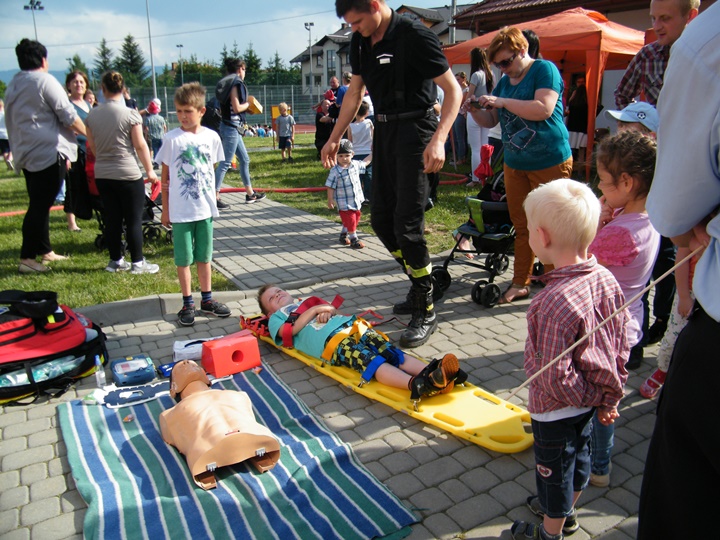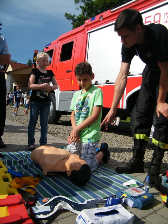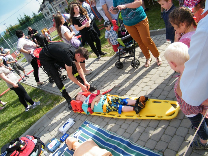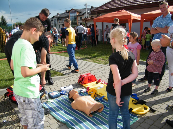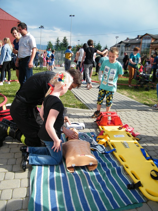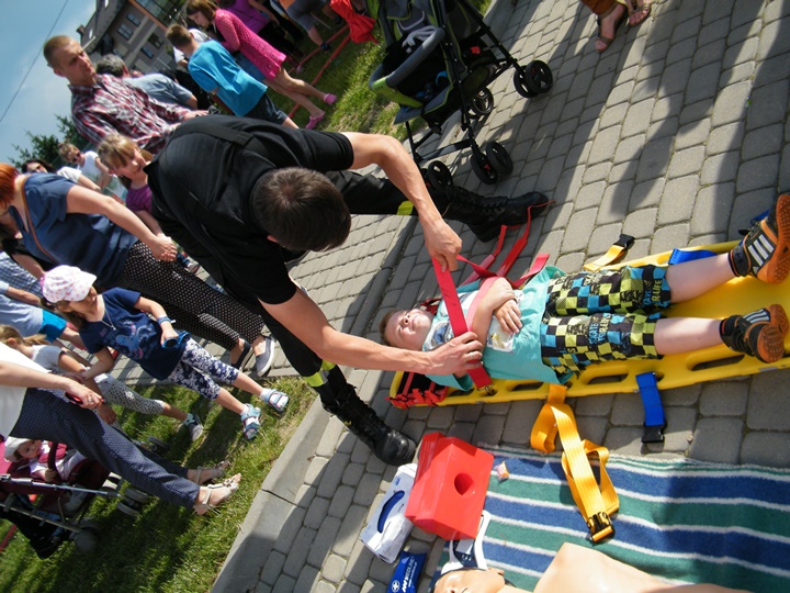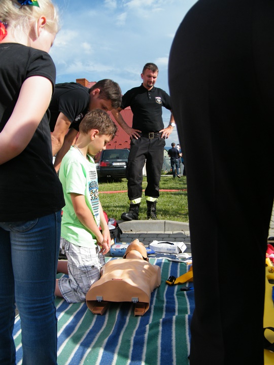 Na drugim stanowisku z kolei udzielany był instruktarz z zakresu zasad udzielania pierwszej pomocy przedmedycznej prowadzony przez dha Mateusza Pietrzaka. Tam również można było zasięgnąć informacji dotyczącej zasad postępowania z osobą nieprzytomną, nieoddychającą, prawidłowego prowadzenia reanimacji, użycia defibrylatora (AED) itp. Osoby zgromadzone z zainteresowaniem uczestniczyły w prowadzonej prezentacji.