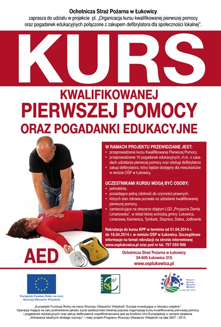 Kurs Kwalifikowanej Pierwszej PomocyW dniach od 25.04.2014 do 11.05.2014 realizowany był kurs kwalifikowanej pierwszej pomocy (KPP) dla I grupy w ramach projektu "Organizacja kursu kwalifikowanej pierwszej pomocy oraz pogadanek edukacyjnych połączone z zakupem defibrylatora dla społeczności lokalnej".