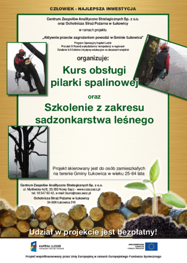 W ramach projektu "Aktywnie przeciw zagrożeniom powodzi w Gminie Łukowica" realizowanego przez Centrum Zespołów Analityczno Strategicznych Sp. z o.o. w partnerstwie z Ochotniczą Strażą Pożarną w Łukowicy w okresie od 01.03.2012 do 30.06.2012 przeprowadzono kurs obsługi pilarki spalinowej.