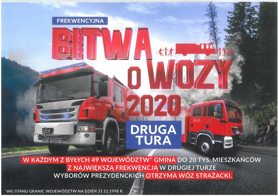 BITWA O WOZY 2020 - II turaPodczas drugiej tury wyborów prezydenckich gminy do 20 tys. mieszkańców, w których zostanie odnotowana najwyższa frekwencja wyborcza, otrzymają wóz strażacki. Do wygrania będzie 49 pojazdów. Znamy już szczegółowe wytyczne drugiej edycji „Bitwy o wozy”.